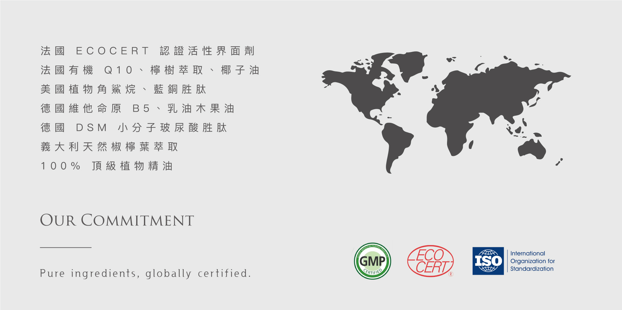 從化妝水到精華液,化繁為簡,濃縮修護運用瑞士專利雙胜肽SYN®-COLL 與 SYN®-HYCAN,為肌膚深層補水,南極冰河醣蛋白分子膜鎖水,雙效合一。藍銅胜肽與靈芝植萃,撫平細紋,緊緻肌膚橄欖葉萃取、MATMARINE™ 和Uniclay™ 三重植萃科技,穩定修護,改善毛孔。